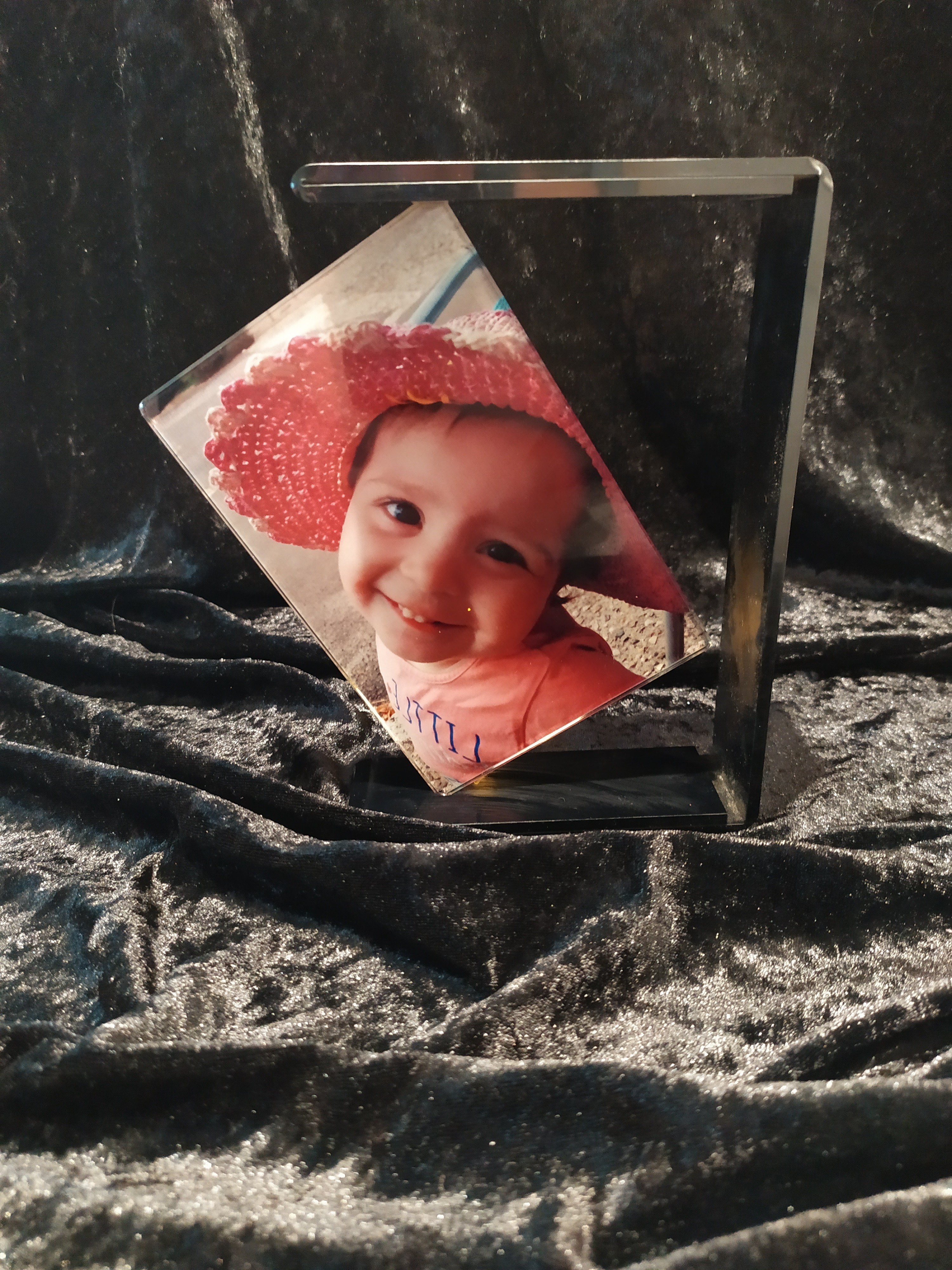 Cadre en verre avec support en plastique noir, totalement personnalisable.
