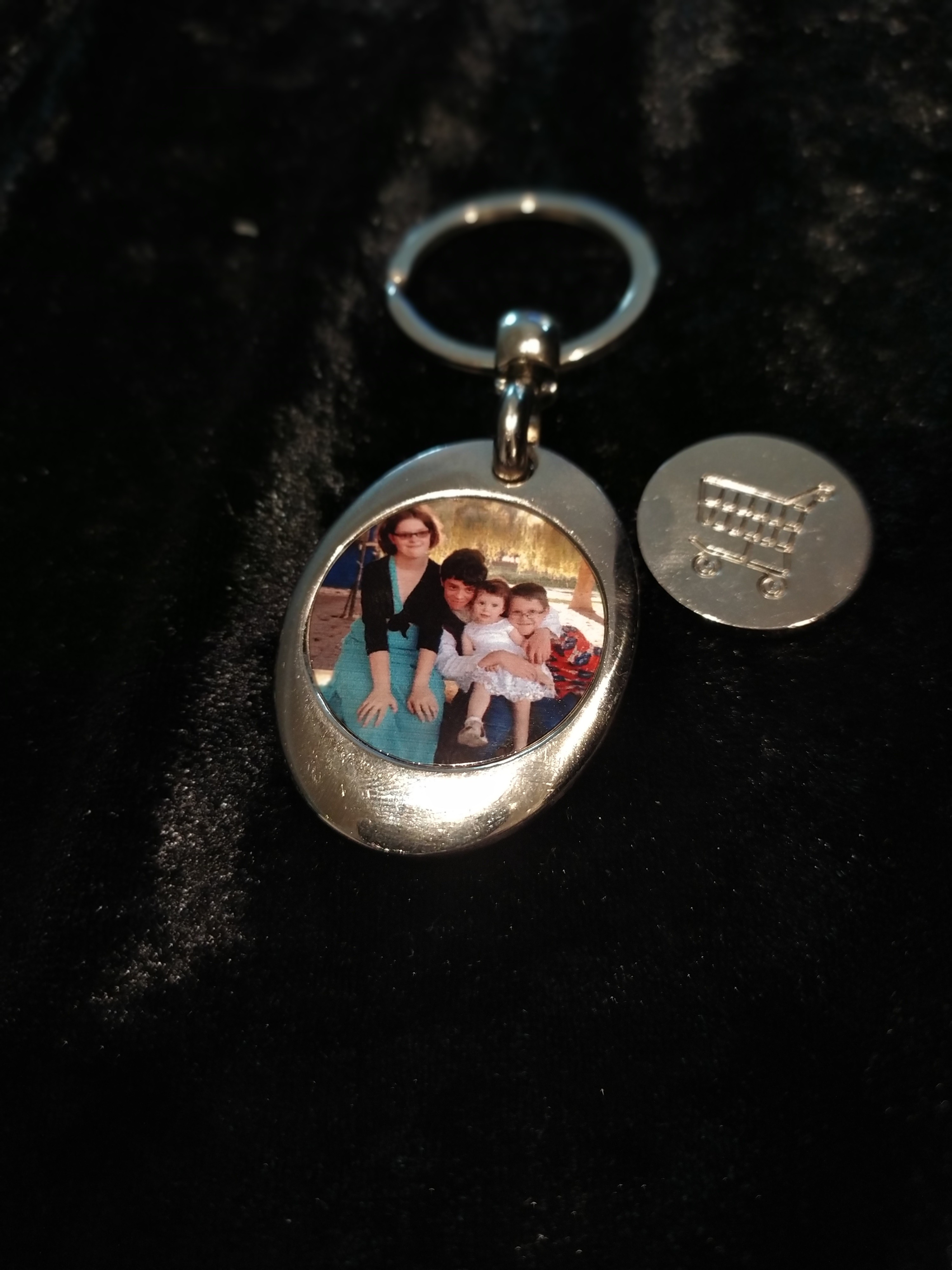 Porte clés avec jeton de caddie intégré. Personnalisable avec photo, image ou texte de votre choix.